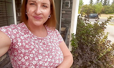 Housewife in sun sundress cum walking after blowjob facial