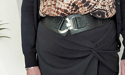 Going to work in a blouse, mini-skirt ,stockings and heels. Prepared for my younger boss to inspect my mature tits, butt and bald cunt.