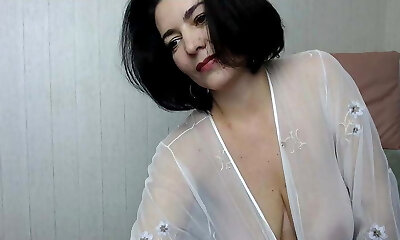 Solo striptease stroking and fingering of horny mature lady with huge natural bra-stuffers