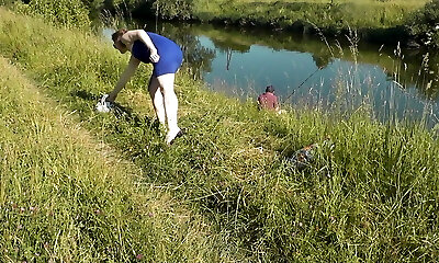 Wild beach. Sexy MILF Platinum nude sunbathing on river bank, random fisherman boy watches. Naked in public. Nude beach